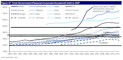 La semana pasada hablamos del déficit no financiero y esta semana con el fin de complementar el artículo anterior, presentamos un gráfico de la evolución de la deuda total de diferentes países desarrollados desde 1990 hasta el primer trimestre de 2012.
