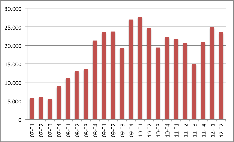 Puede que si las entidades financieras hubieran vendido en el mercado sus activos problemáticos no hubiera hecho falta tapar con dinero público su mala gestión. En este sentido quisiera recordar que a día de hoy la banca española ha recibido hasta agosto de 2012 €21.000MM de dinero público, más €260.000MM del BCE (entidad pública) a un vencimiento de 2 año y con unos intereses del 1%. Si esto no fuera poco a partir de agosto de 2012 se le asignaron €55.000MM más a cargo de los Presupuestos Generales del Estado, más una ayuda de la Unión Europea que podría llegar a los €100.000M. La suma del total de ayudas a la banca española es de €436.000MM que equivale al 40% del PIB de España. Quizás la banca ha vivido por encima de sus posibilidades.
