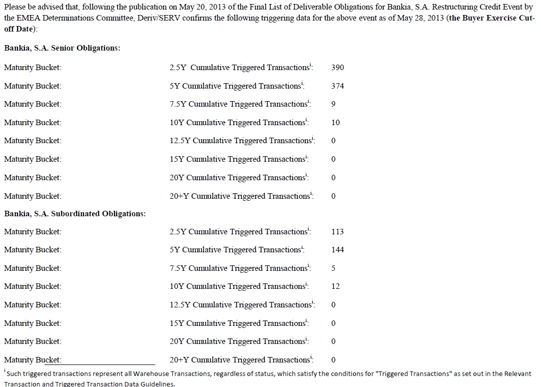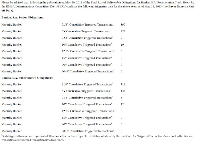 Por si alguien tenía dudas sobre la estafa de Bankia sobre las Participaciones Preferentes, la Deuda Subordinada y el impago de Deuda Senior, el ISDA (International Swaps and Derivatives Association Inc., en español "Asociación Internacional de Swaps y Derivados") ha elaborado una lista por vencimientos de todas las emisiones afectadas por la Reestructuración del FROB.