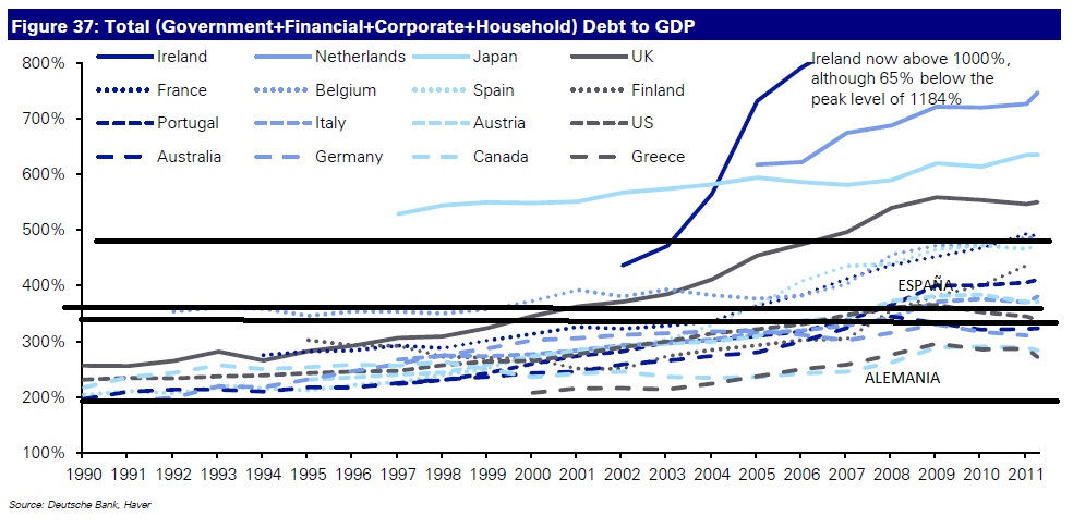 La semana pasada hablamos del déficit no financiero y esta semana con el fin de complementar el artículo anterior, presentamos un gráfico de la evolución de la deuda total de diferentes países desarrollados desde 1990 hasta el primer trimestre de 2012.