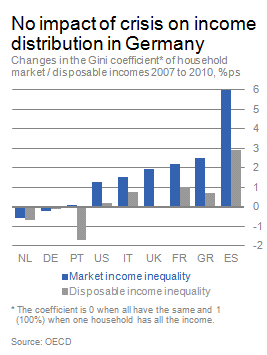 Respecto a España, precisa que la desigualdad en 2010 aumentó notablemente debido al aumento del desempleo y a la ineficacia de la redistribución de los impuestos que fueron incapaces de compensar la pérdida de ingresos familiares y por lo tanto aumentaron notablemente el grado de desigualdad.