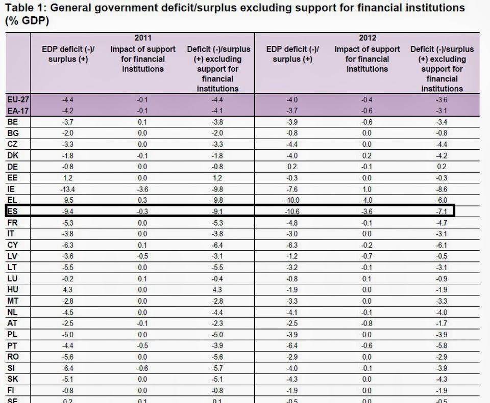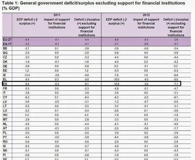 Esta falsedad en las cifras no viene por una impresión subjetiva, de hecho, la Unión Europea ya rectifico las cifras dadas por el gobierno español en la revisión de abril de 2013 sobre el PIB y estimo el impacto de la ayuda al sostenimiento de las instituciones financieras españolas sobre el déficit público del 7,1% en 2012 y en 2011 en el 0,3%. Esto equivale a un monto en 2012 de algo más de 71.000 millones de euros y en 2011 a unos 4.000 millones de euros.