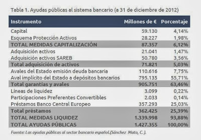 En principio, el gobierno admite que desde 2.009 ha 2012, la inyección de dinero público, avales, etc, ha sido de 61.366 millones de euros cantidad que parece ridícula en comparación con los recortes practicados por el gobierno en prestaciones sociales, dependencia, educación, etc y que estaban justificados por las necesidad de asistir a las entidades financieras para poder salir de la crisis. Como ejemplo sirva que el decretazo de julio de 2012 (RD 20/2012) ya fue de 55.000 millones de euros.
