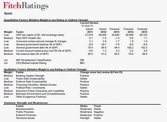 Es curioso que Fitch incida en los falsos titulares de la prensa española basados en el informe del Banco de España de octubre o en la nota de prensa sobre el dato provisional del tercertrimestre del PIB del INE. En cambio, y sin problemas predice que España crecerá en el 2014 un 0,5%. A mí por lo menos me parece curioso que puedas predecir lo que ocurrirá el año que viene y no lo puedas hacer el tercer y cuarto trimestre de 2013.
