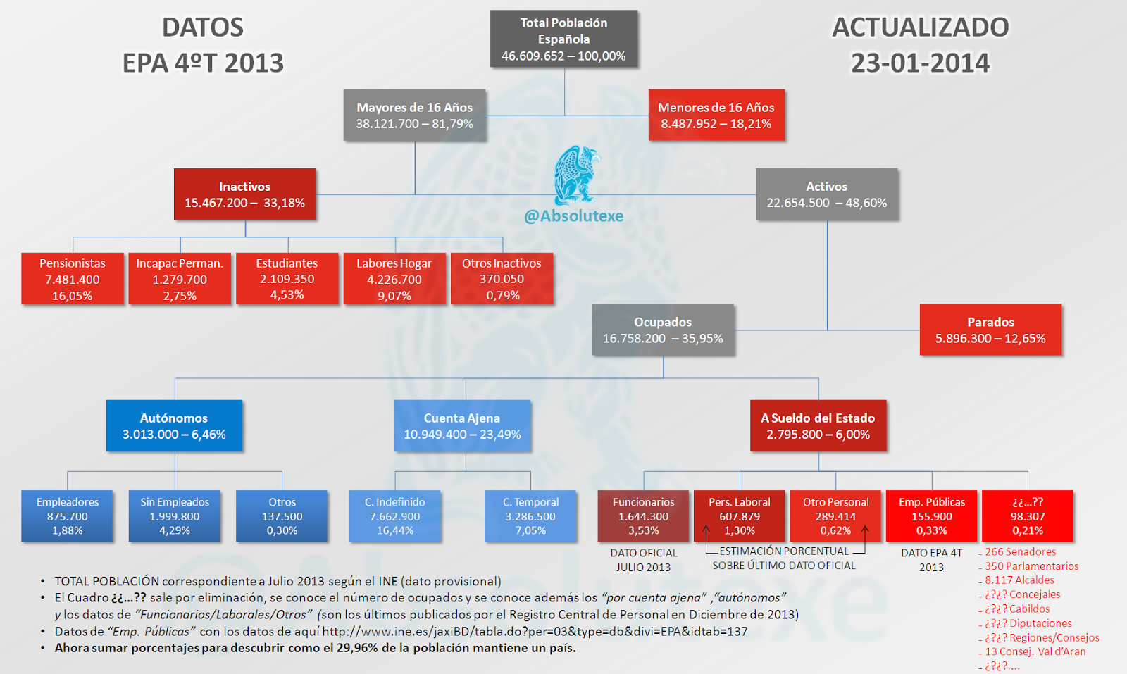 Estoy seguro que este 29,96% es una deducción manipulada, pero me temo que contar a los funcionarios, políticos, etc carece de sentido puesto que su salario proviene de las arcas públicas, por lo cual no aportan nada en sentido estricto al mantenimiento del Estado, su dinero sale y entre en la misma caja.