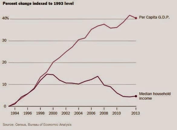 Por último también hacemos una referencia a la gráfica publicada por el "Bureau of Economics Analysis" y que demuestra como el crecimiento del PIB per capita no supone una mejora de la riqueza de las familias de la clase media.