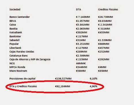 Una vez cubierta la banca a través de los artificios fiscales de los “Activos Fiscales Diferidos”, DTA y de los “Créditos Exigibles ante las Administración Tributaria”, Créditos fiscales, el gobierno lo único que tiene que hacer es compensar la pérdida de ingresos fiscales de 62.184 millones de euros del año 2013 a los ciudadanos españoles y a la pequeña y mediana empresa aumentando la presión fiscal, persiguiendo la pequeña evasión fiscal, recortando las partidas relativas a educación, sanidad, etc y vendiendo o trasfiriendo las empresas y servicios públicos a la iniciativa privada.