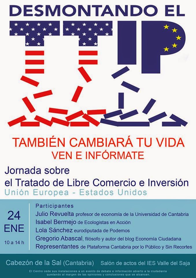 Desde Economía Ciudadana (@citizeneconomy) nos sentimos honrados por poder participar en la primera Jornada en Cantabria de "Desmostando el TTIP" sobre el Acuerdo Transatlántico de Comercio e Inversiones que están negociando en el más absoluto obscurantismo la Unión Europea y los Estados Unidos.